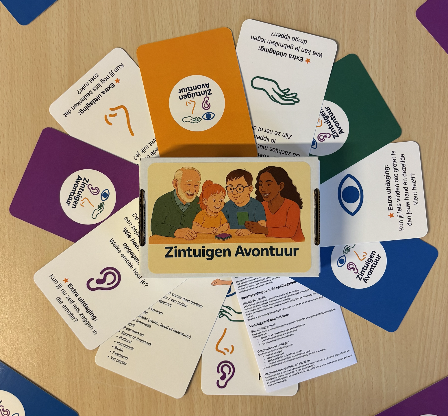 In elke verpakking vind je vier stapels opdrachtkaarten – één voor elk zintuig (zien, horen, voelen en ruiken) – plus de spelregels en een ‘bij de handje’ materialenlijst.